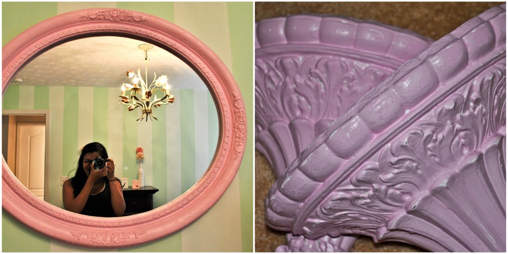 We've got 4 weeks to go until showtime and G and I have been working furiously to get everything we can prepared ahead of time. The nursery for the most part is done, save a piece or two. A few weekends ago I finally tackled the job of refinishing a mirror and shelves for baby girl's room to add the last bit of feminine touches.